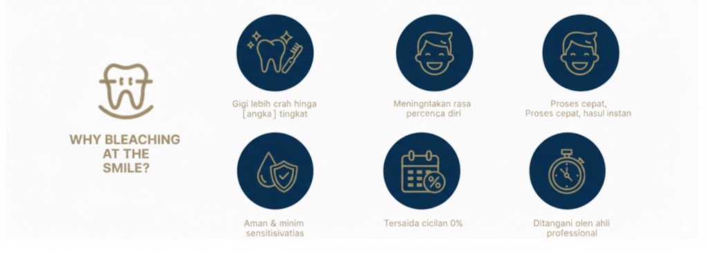 Bleaching gigi bermanfaat untuk mencerahkan warna gigi yang kusam atau menguning akibat makanan, minuman, atau faktor usia, sehingga senyum terlihat lebih bersih dan menawan.